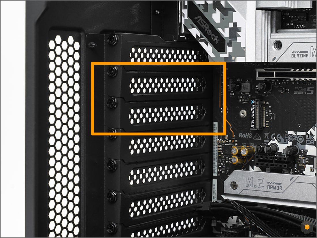 그래픽카드 브래킷 면적을 확인 후 케이스 확장 슬롯 커버를 제거합니다. 사용한 그래픽카드는 브래킷이 2슬롯이라 표시한 슬롯 커버 2개를 제거하면 됩니다.