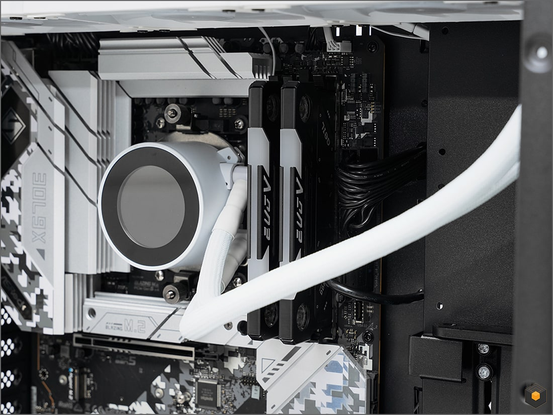 그래픽카드를 장착 후 보조 전원 커넥터를 연결합니다. ATX 3.0 파워서플라이를 사용했기에 변환 젠더없이 12VHPWR 커넥터를 직결할 수 있습니다. ATX 3.0 규격이 아니거나 12VHPWR 커넥터가 없는 파워서플라이를 사용한다면 그래픽카드에 동봉된 12VHPWR to 8PIN 변환 젠더를 이용하면 됩니다.